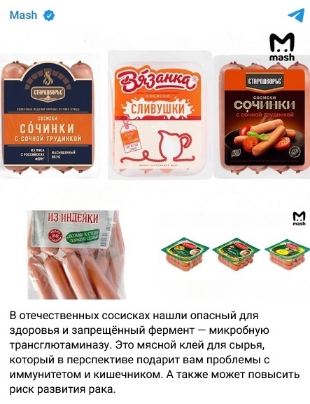 Говорим за трансглутаминаза, или "месно лепило", което е намерено в продуктите на марката Starodvorskie Sausages". По-специално, забранената съставка беше включена в колбасите "Вязанка", "Стародворская", "Сочинка" и "Докторская". "Лепило" е открито и в Кремлевски, Зернисти и други сервилати.
